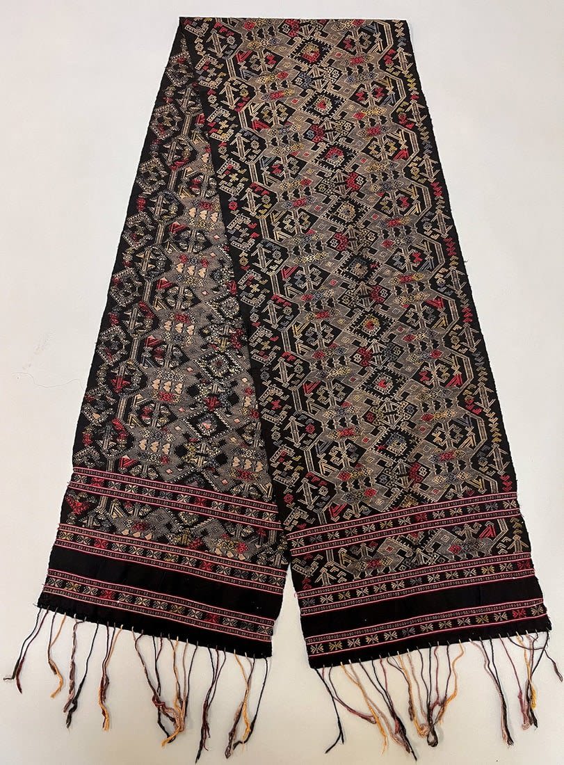 Laos, vintage cotton and silk brocade shoulder cloth, black ground with traditional assorted muted color pattern, 83"l x 14"w