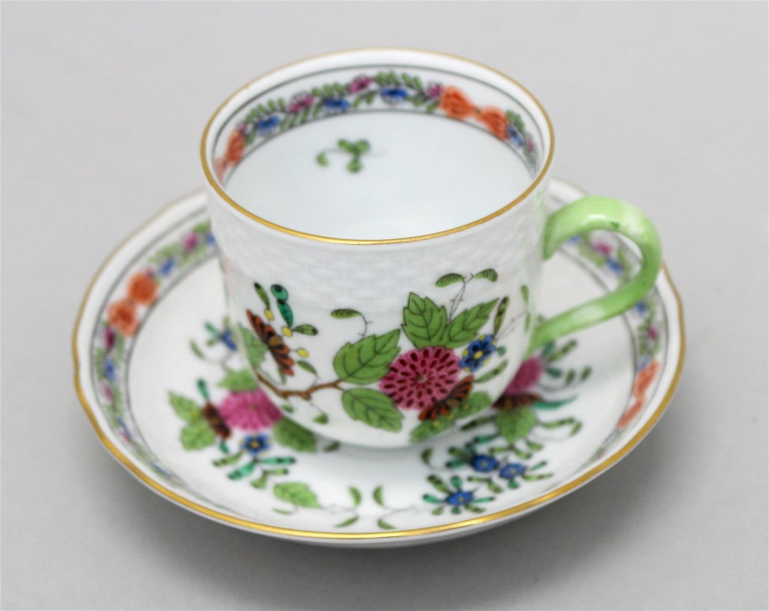 Vintage Herend porcelain Indian Basket tea cup with saucer, mark Herend-Hungary, Handpainted, 1727/FO on the bottom, cup: 2.25"h x 2.25’d, saucer: 4.25"d