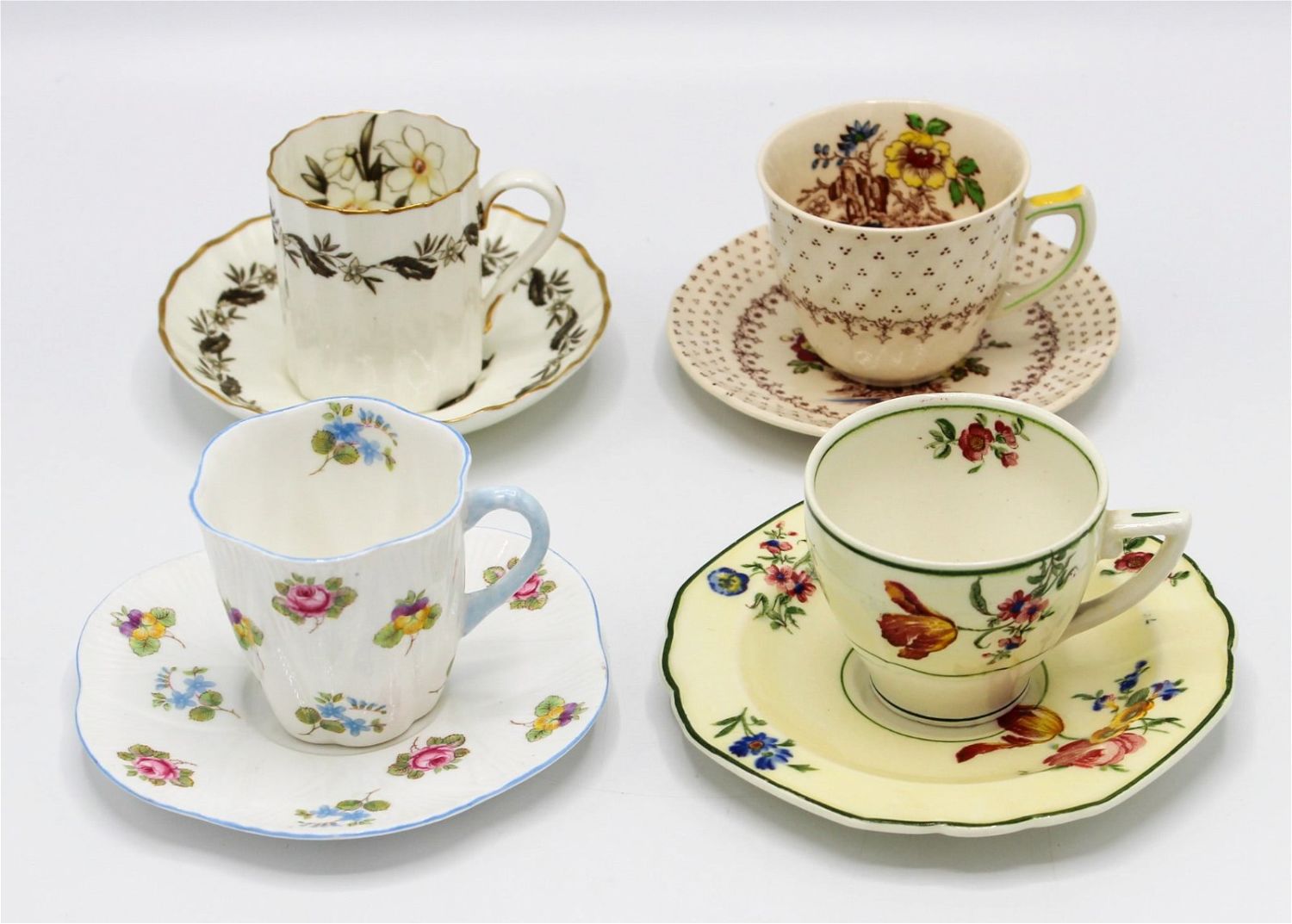 Vintage group of (4) assorted sets of tea/demitasse cups with saucers, marks on bottom, (1) Royal Worcester England "Engadine", (1) Royal Doulton England "Grantham", (1) Grindley & Co England Reg. No 73 554, (1) Shelly England Rd 272101, approximately each cup 2.25"h x 2"d, saucer 4.25"d
