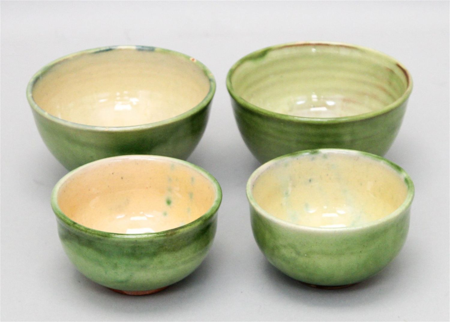Group of (4) Terra Cotta bowl with green glaze, illegible signature on bottom, two large bowl 3"h x 5"d, two small bowls 2.5"h x 4.25"d