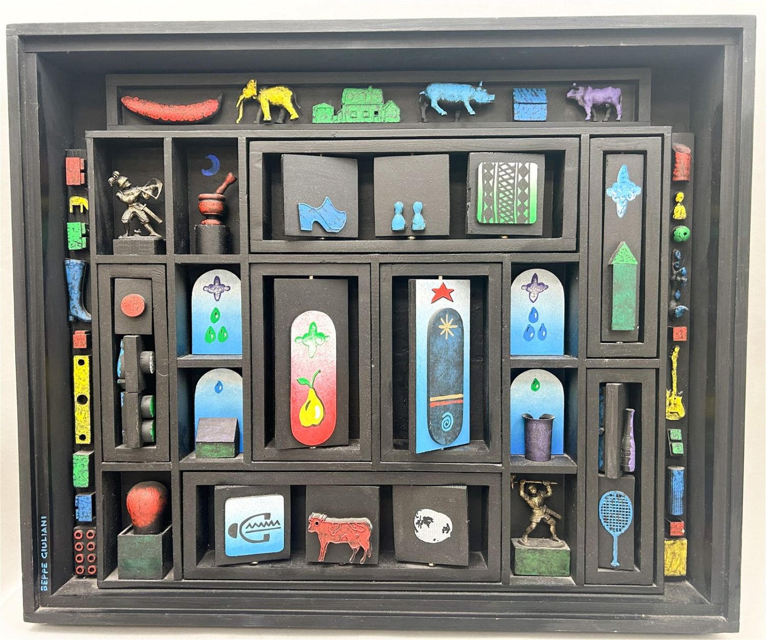 Beppe Giuliani (Italian, b. 1946) "L’Elefante Giallo" black painted shadow box sculpture with manually revolving found objects, signed on lower left Beppe Gouliani, label on verso, 20"h x 23.75"w x 3"d