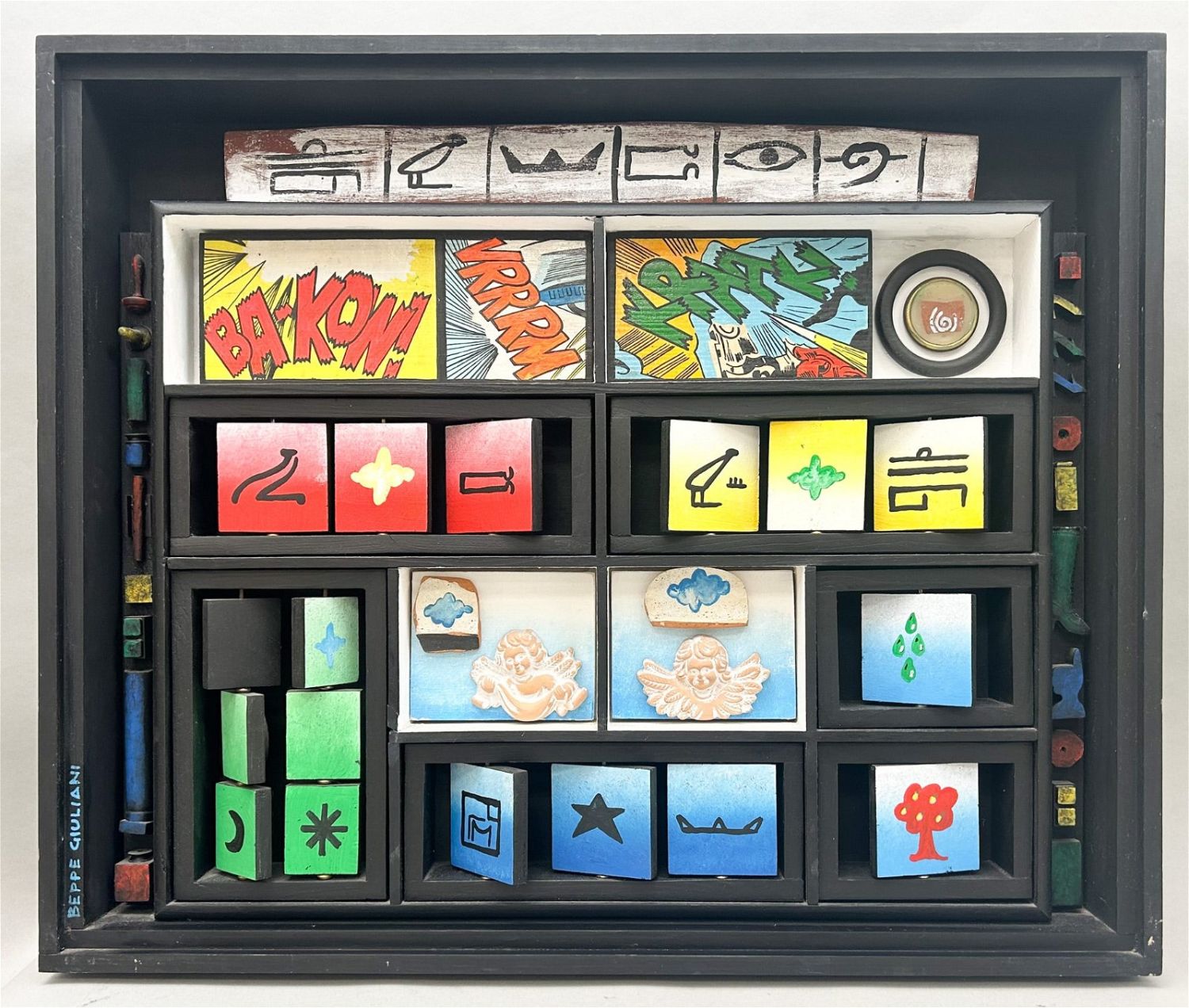 Beppe Giuliani (Italian, b. 1946) "Eggito Uno" black painted shadow box sculpture with manually revolving found objects, signed on lower left Beppe Gouliani, label on verso, 20"h x 23.75"w x 3"d