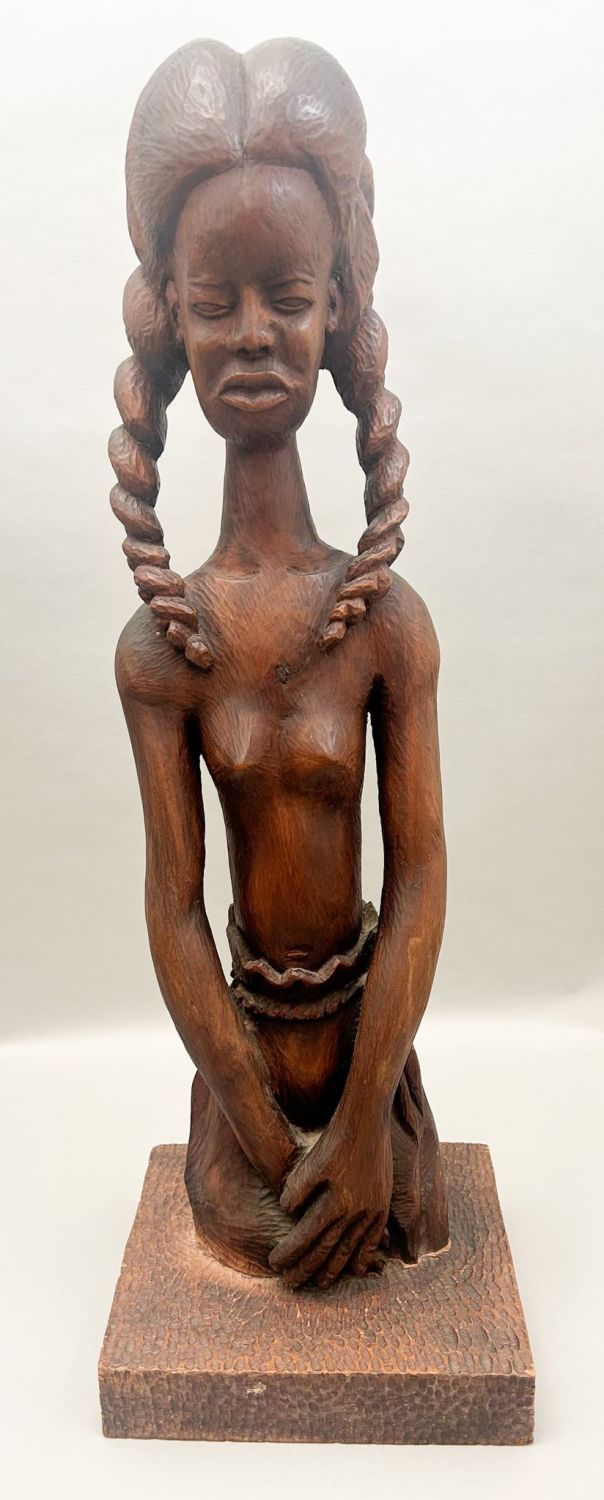Large figural sculpture, Joubert Duperiour (Haitan, 20th c.) Young woman with braids, carved hardwood on chip carved base, signature incised underneath, approximate size, 30.5"h x 10"w x 8.75 "d
