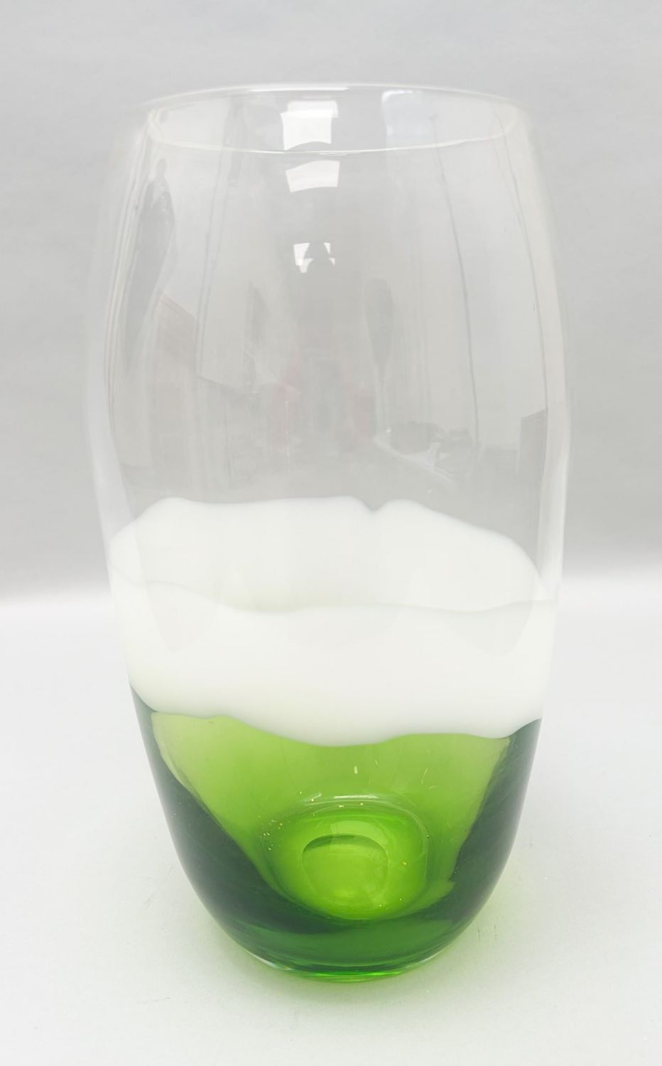 Emerald green and white hand blown art glass vase, 12.5"h x 7 "d Condition: Good