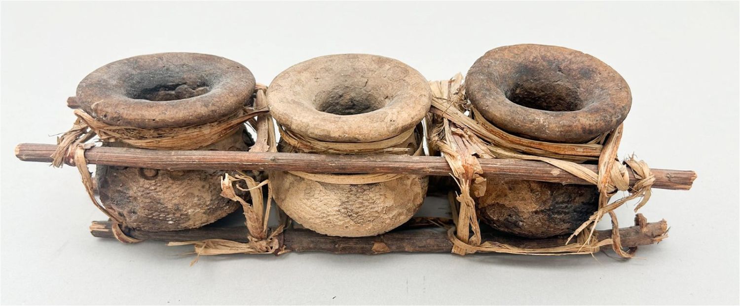 African triple clay pots, possibly from Kenya, 10"h x 3"w x 2.75 "d Condition: Fair, some wear due to age, damages on bamboo leafs and sticks