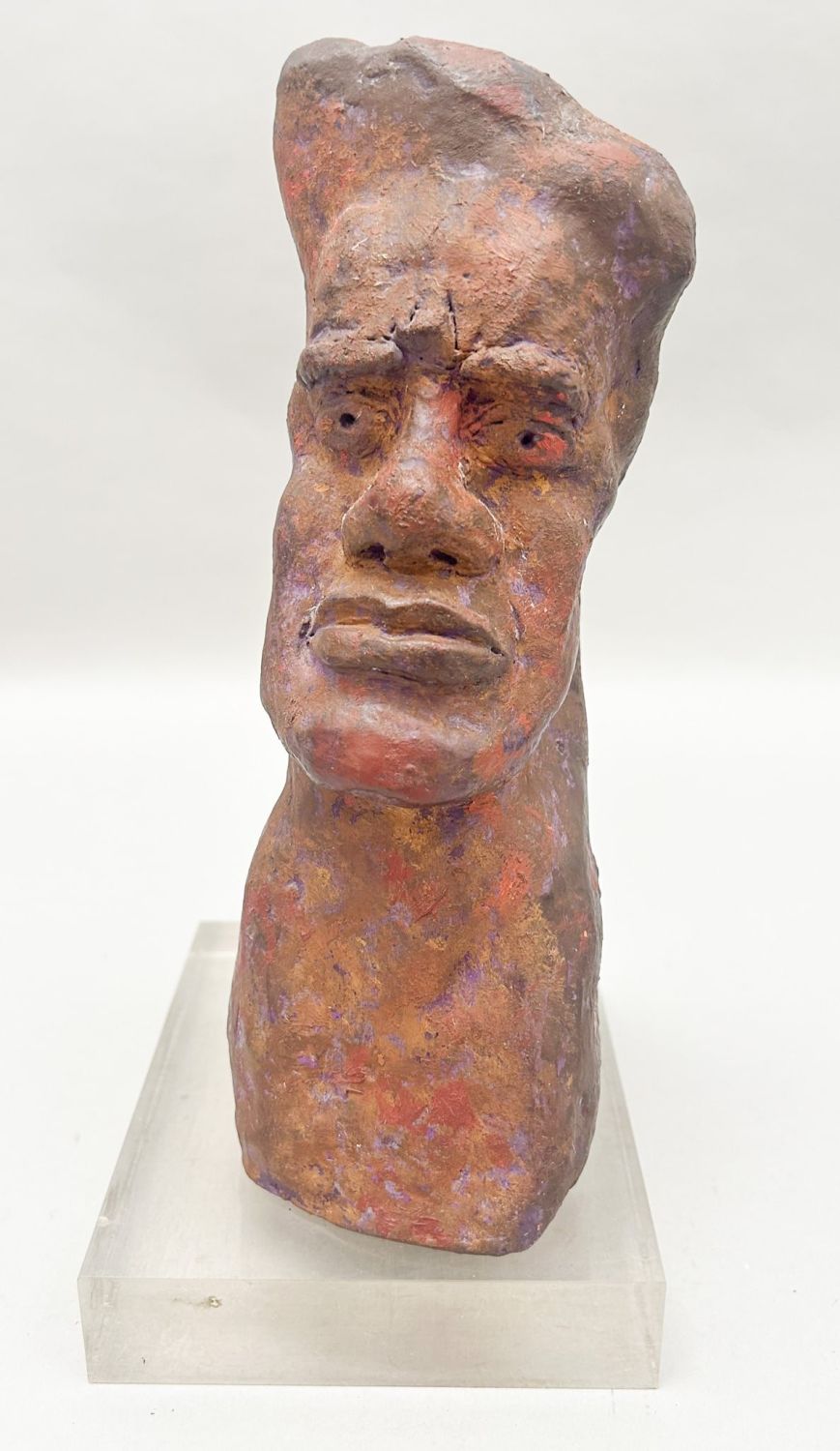 Terracotta man face sculpture on plexiglass base, unmarked, base 1.25"h x 5.5"w x 4.5"d and sculpture 9"h x 6"w x 3.5 "d Note: Description on this lot has been updated