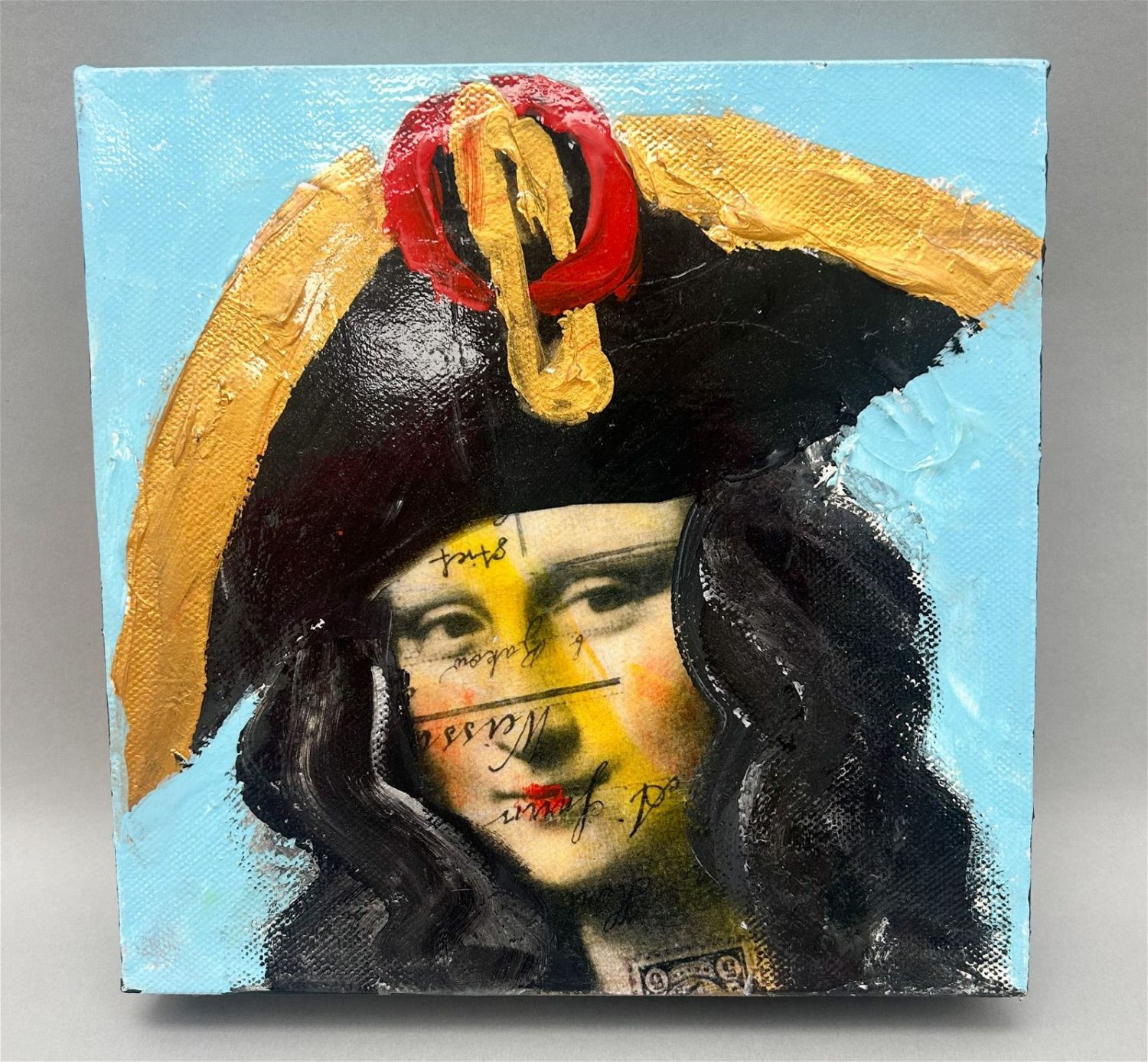 Oil painting on canvas, pop art of Mona Lisa depicted as a pirate, 8"l x 8"w