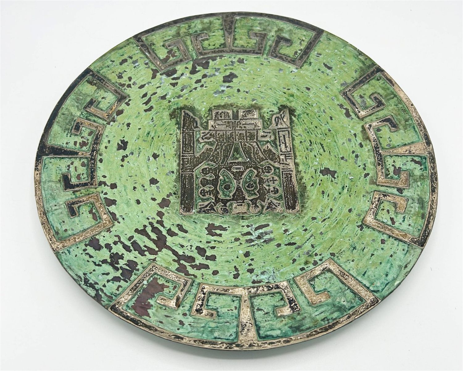 Vintage Cuzco Peru souvenir hanging plate, silver on copper, 11.75"d Condition: Fair, chipped paint, sign of use and wear