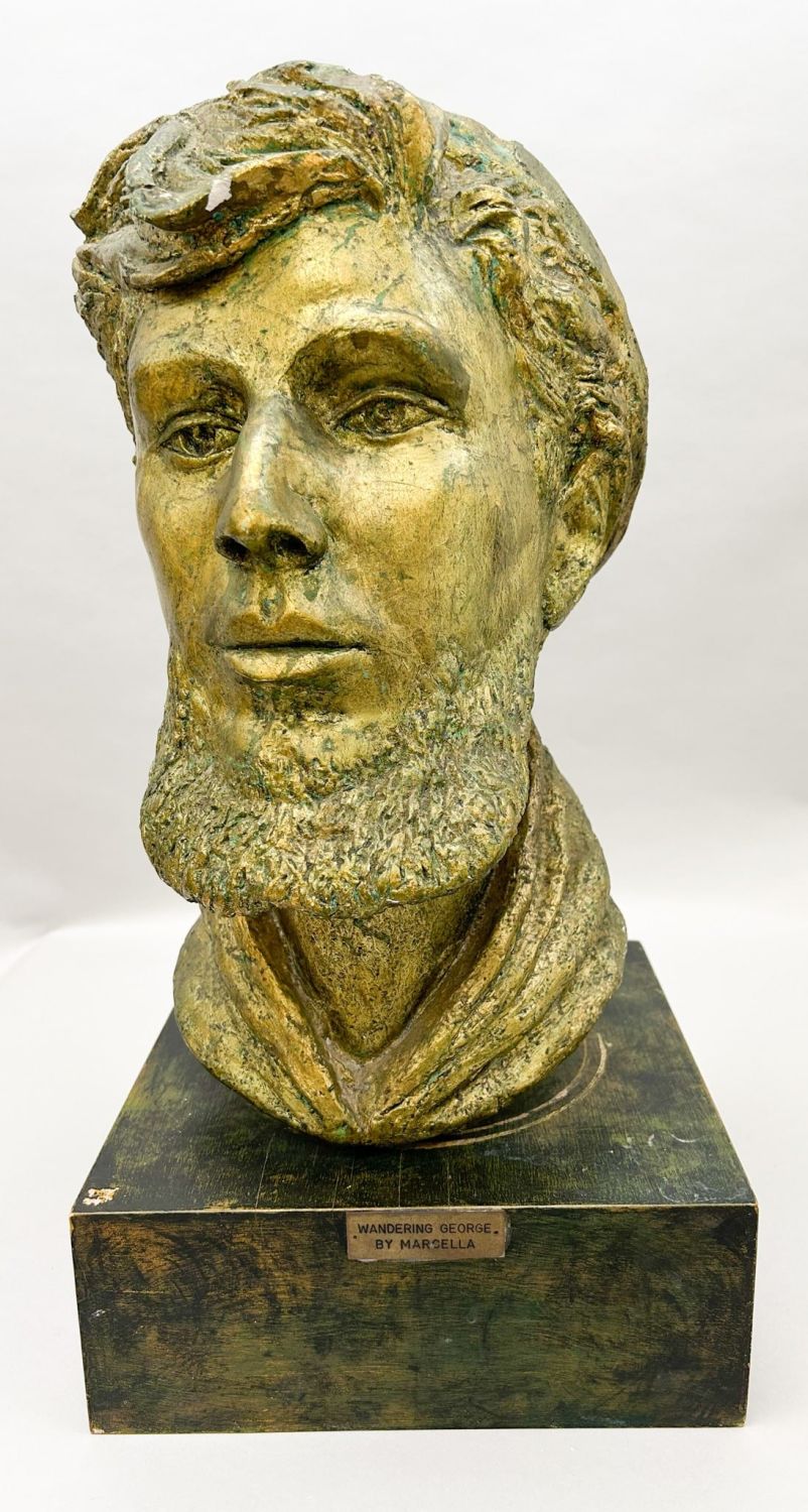 Vintage gypsum bust with painted gold toned, stand on wooden base, signed as "Wandering George by Marcella", base size 4"h x 10"w x 10"d and sculpture size 16"h x 10"w x 10"d