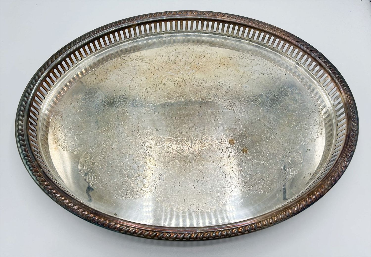 Vintage silver plated large oval serving platter, presented to Governer Abraham A. Ribicoff, faded marks on back side "W & S Blackinton", 18"l x 13"w