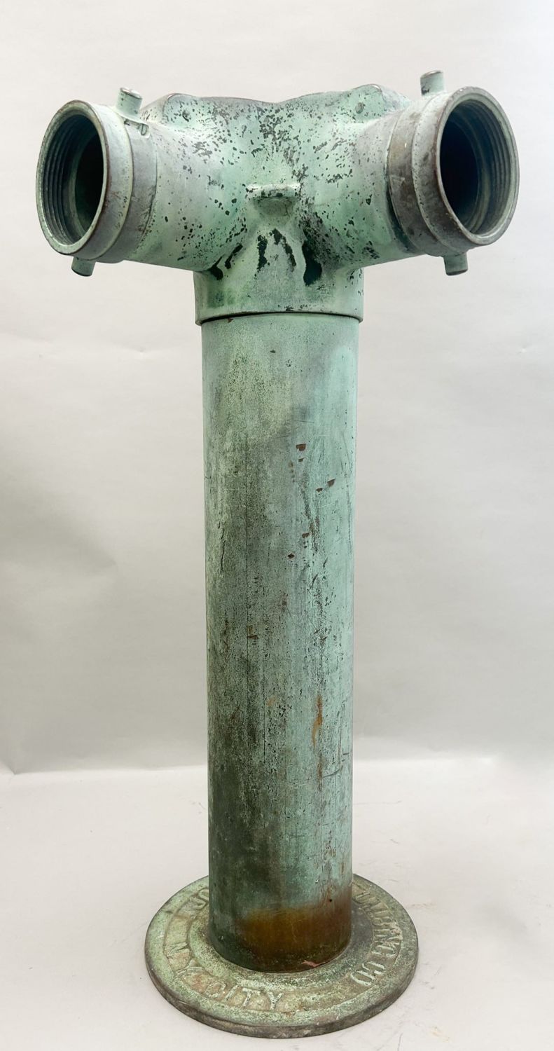 Antique olid brass standpipe marked John Weil Plumbing Co, NY City, 25"h x 10"w x 10"d