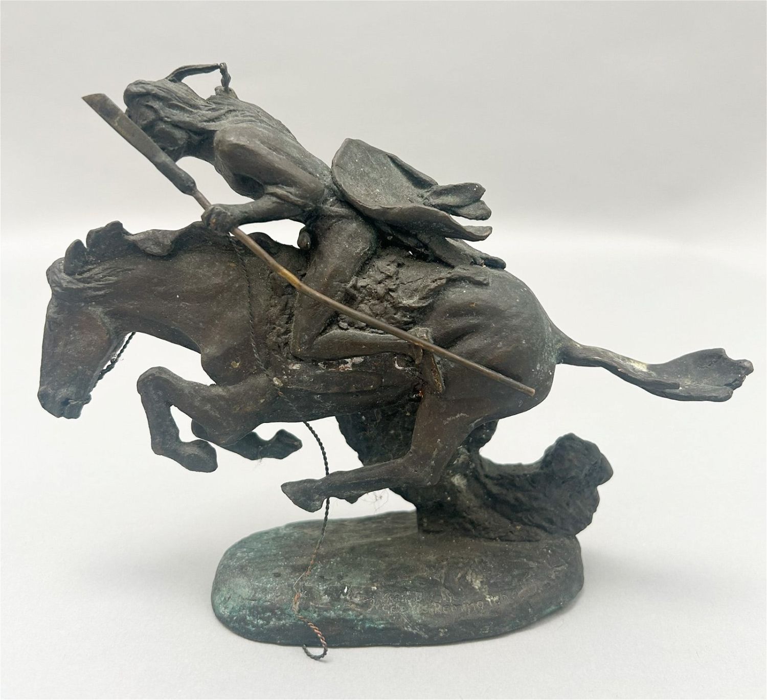 Vintage 1988 Franklin Mint ”The Cheyene” Native Horse Statue depicting a Native American man riding a galloping horse, Frederic Remington reproduction, 5.75"h x 6.75"w x 2"d