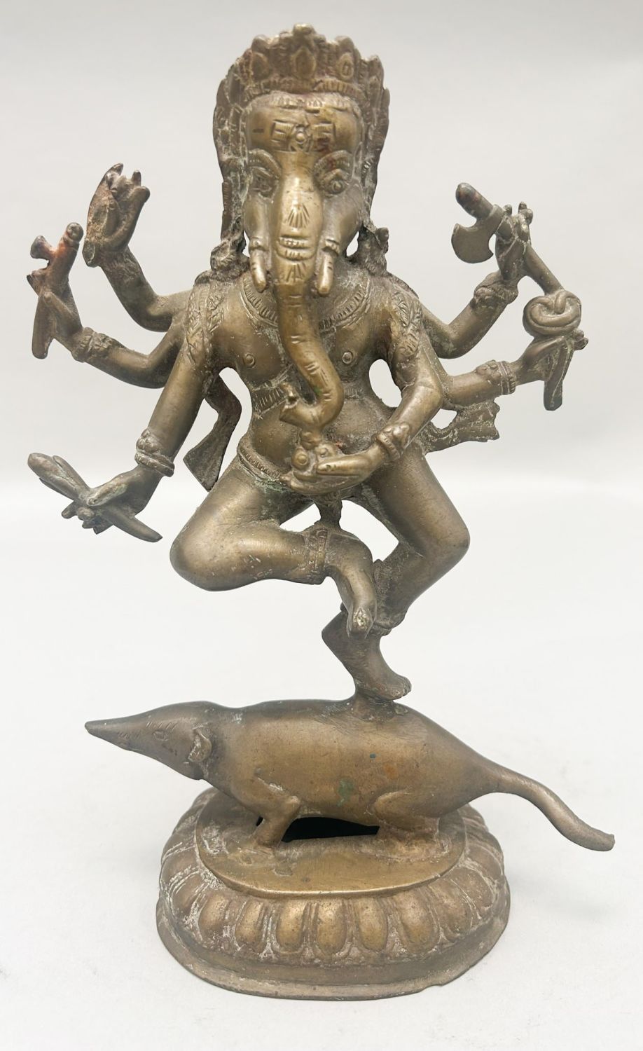 Unique shaped with Nepali motifs, 10.25"h x 6.75"w x 3.5"d Condition: Good, some scratches and scuffs, some tarnish, some dirt, a minor hole, signs of wear and age