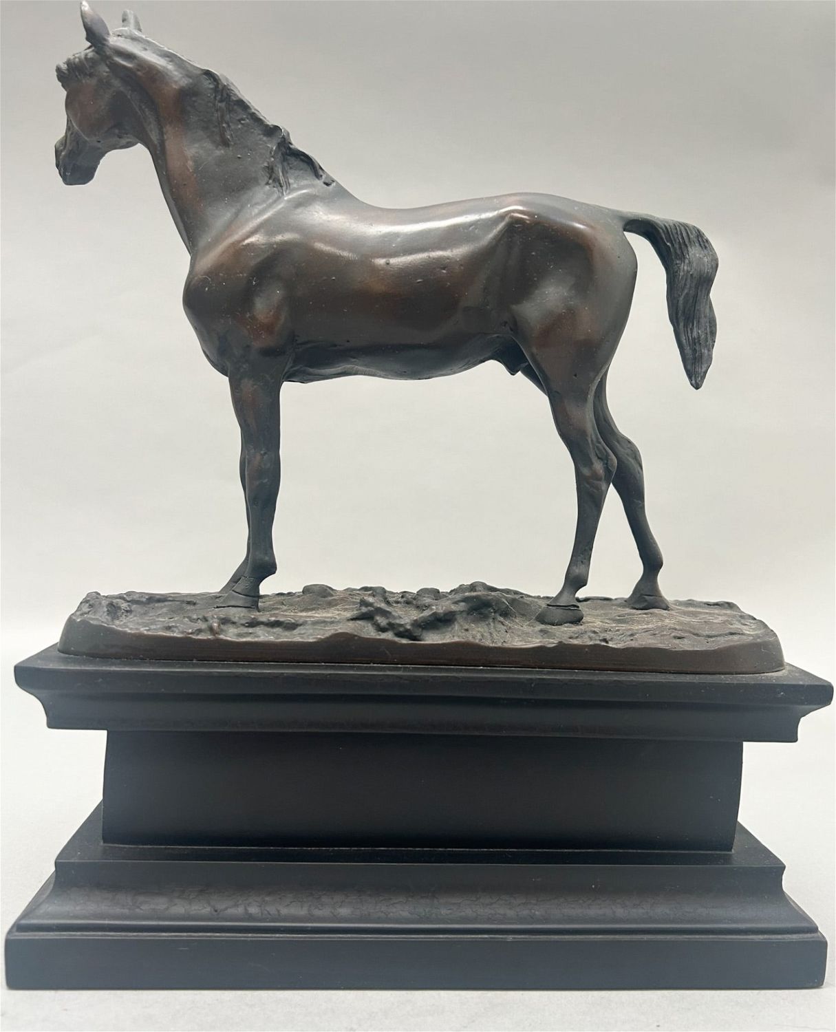 Redinha, Jument Anglaise de Sang” patinated bronze horse sculpture on wooden frame, after Pierre-Jules Mene, 11"h x 9"w x 4"d Condition: Good, light scratches