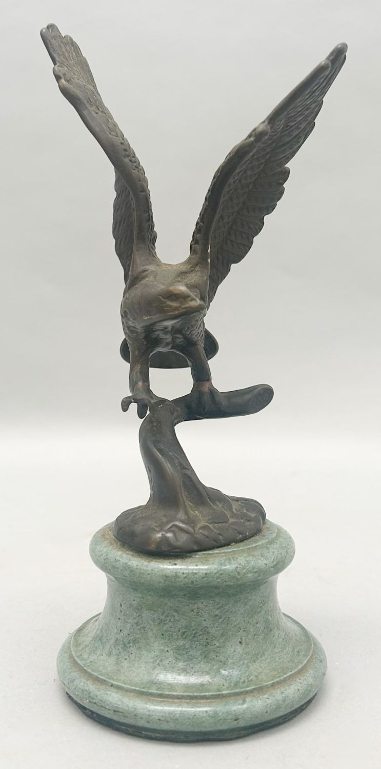 Vintage bronze eagle statue on green marble or granite base, unsigned, 9"h x 4"w x 4"d Condition: Good, some scratches, some tarnish, some dirt, signs of wear and age