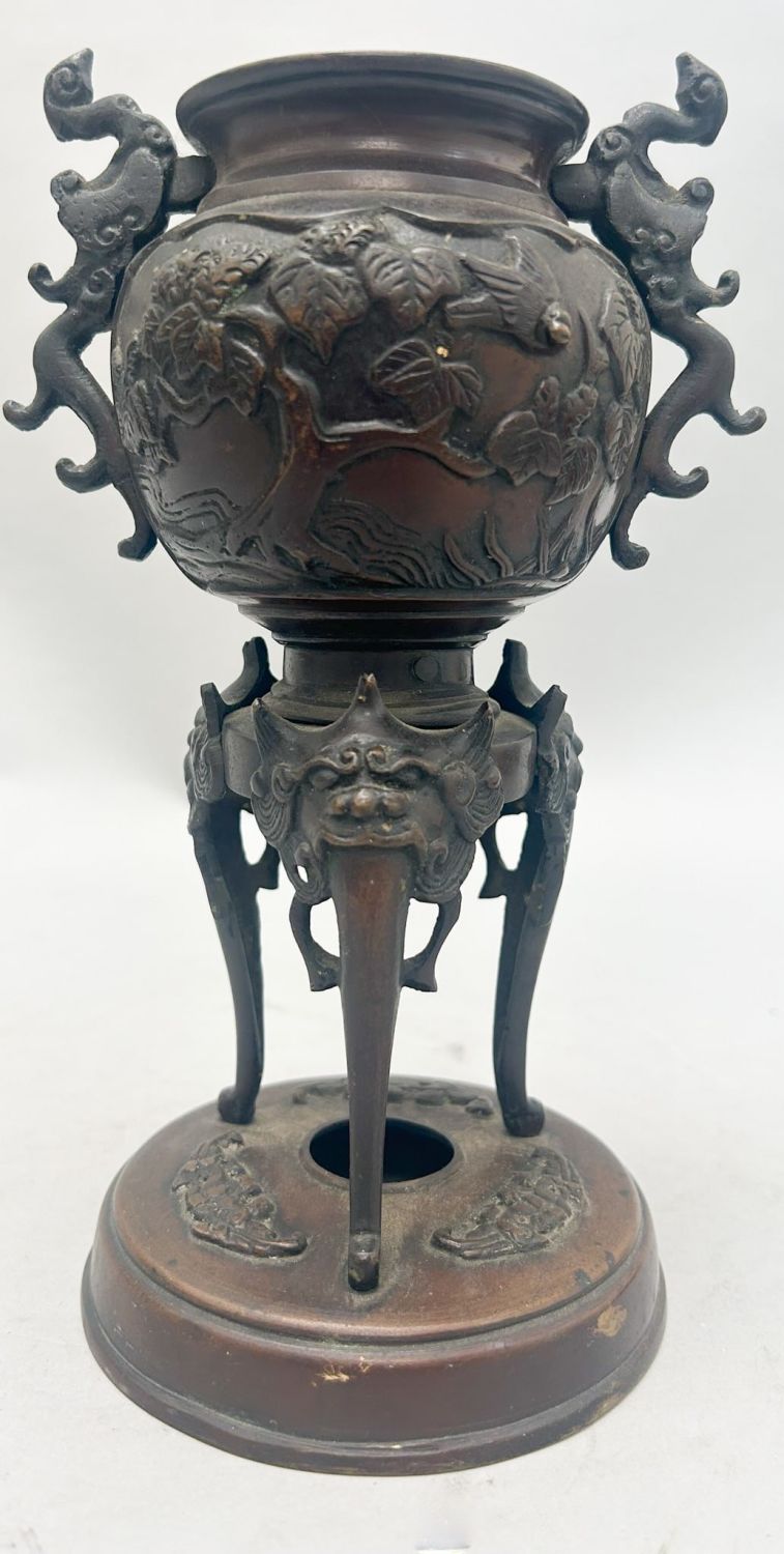 Antique Chinese bronze censer, urn form with cast animals and flowers, stepped on circular foot, possibly 19th Century, 8"h x 5"w x 3.5"d