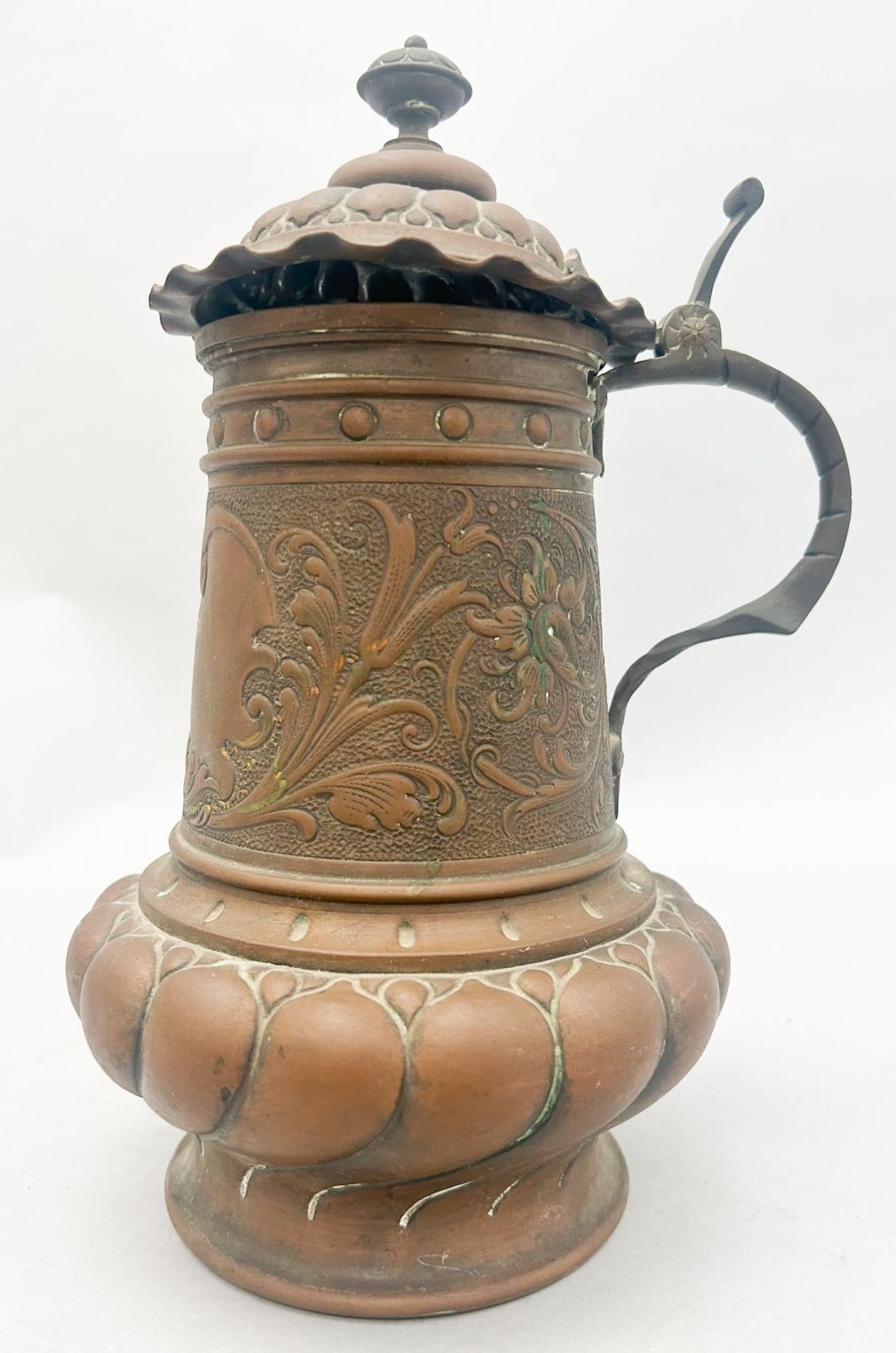 Antique flower engraved copper mug or pitcher, 10"h x 6"w x 7"d