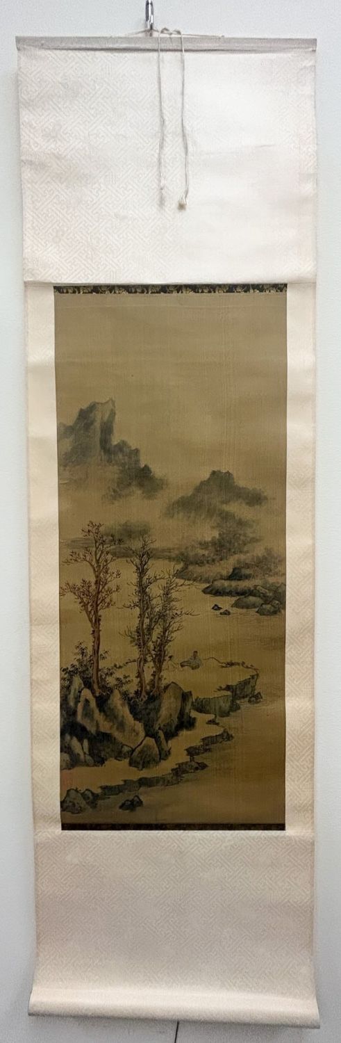 Chinese hand-painted silk scroll landscape wall hanging, whole dimensions 50"l x 14.75"w and sight dimensions 23.5"l x 9"w