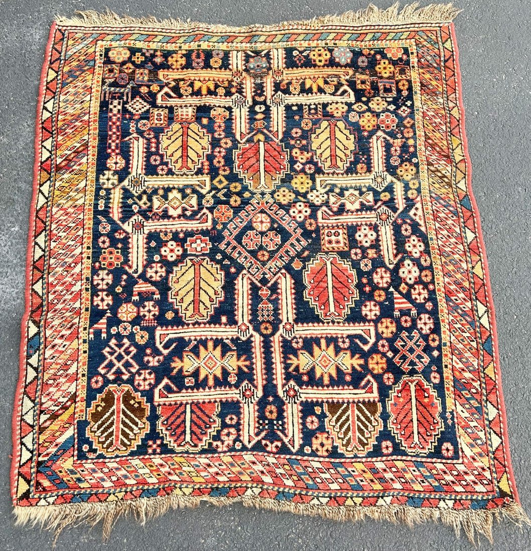 Vintage Persian handmade wool rug in dark blue, red and white shades, 50"l x 45"w
