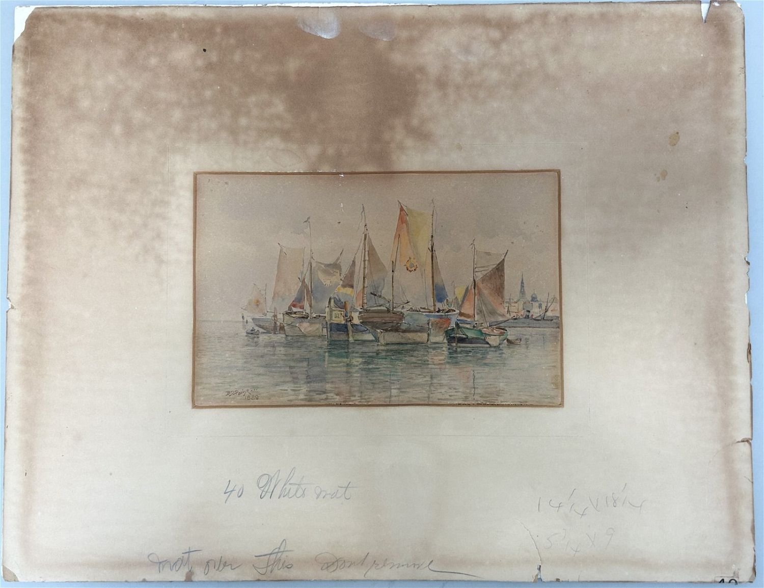 Antique watercolor painting, ”Dutch Fishing Boats” signed by D. Diane, 1889, frame size 18"l x 14"w and sight size 9"l x 6"w