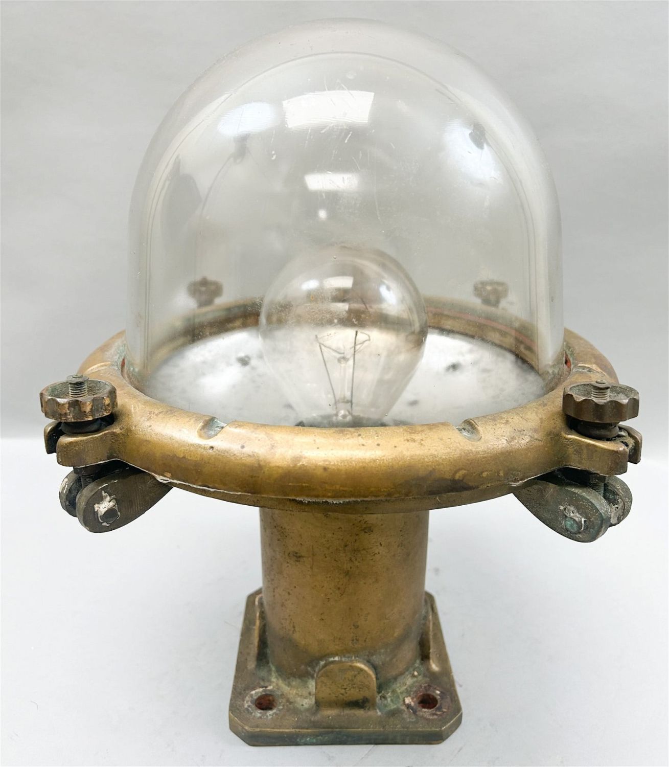 Vintage large brass marine or industrial lamp on iron base, 15"h x 12"w x 12"d Condition: Good
