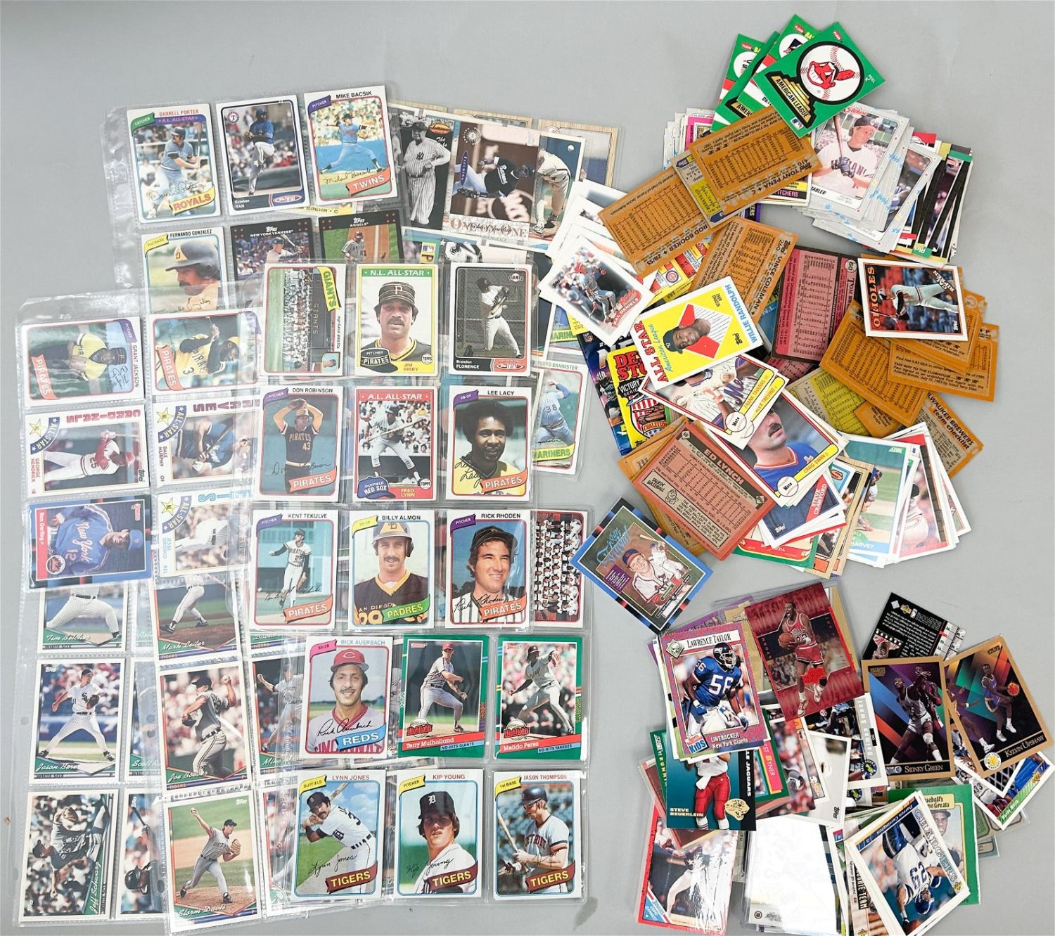 Baseball cards wih Nolan Ryan, George Brett, Johnny Bench, Mets pack baseball, basketball with Jordan, hockey with Gretz, 2021 Panini wax packs, football cards with Manning, Woodson and Warner