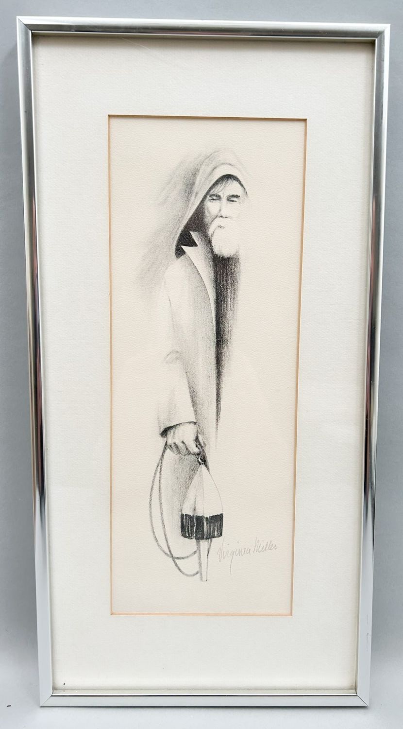 ”The Old Fisherman” signed by Virginia Miller, charcoal on paper and framed, frame size 16.25"l x 8.25"w, sight size 12"l x 4.5"w