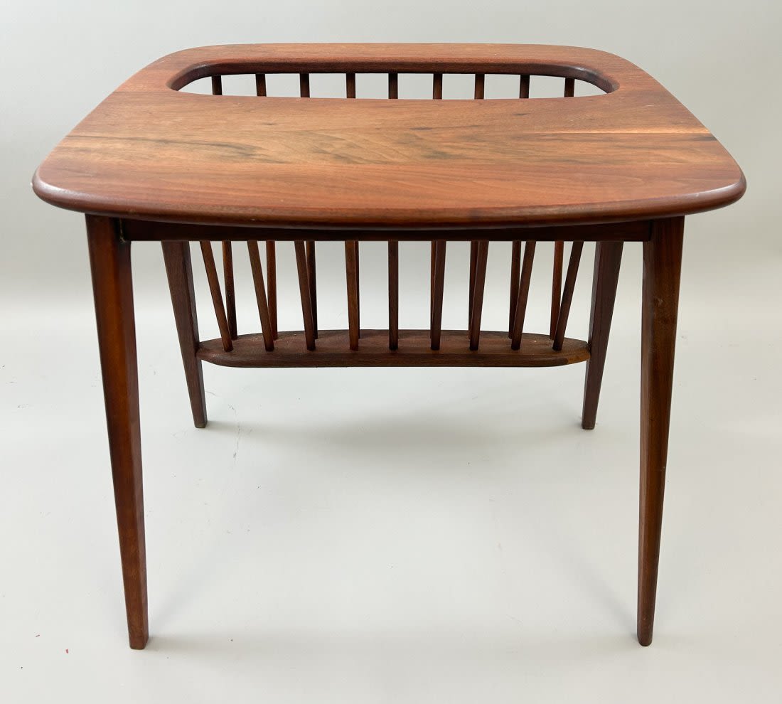 Mid century modern walnut side table with magazine rack with spindled sides, splayed legs and an rounded edge square top surface, designed by Arthur Umanoff for Washington Woodcraft, 1960s, 20"h x 22"w x 18"d