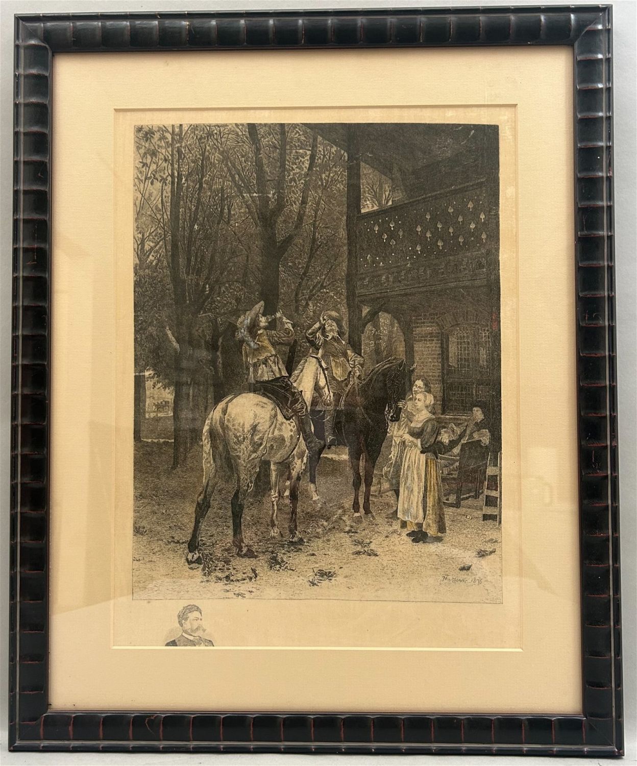 Etching by Meissonier, dated 1876, framed in glass, frame size 22"l x 17.75"w and sight size 19.5"l x 15.5"w Condition: Good, light scratches and chip on frame