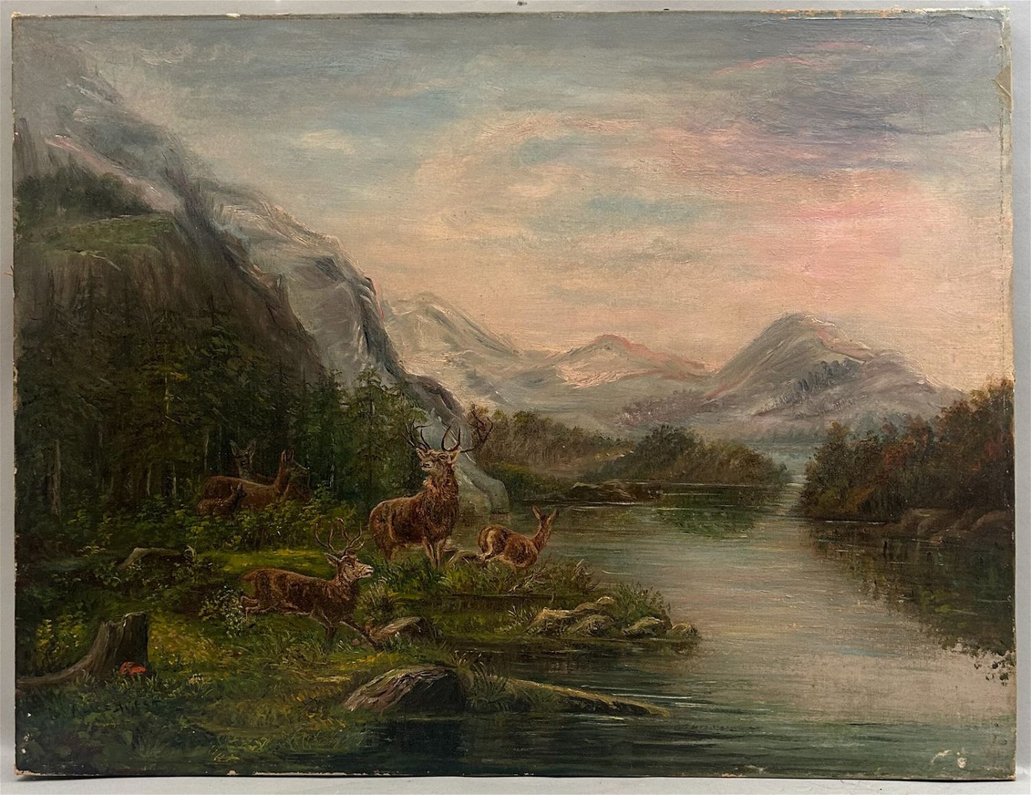 Oil on canvas, deers in riverscape, signed by Alice, sight size 20"l x 26"w Condition: Good, light stains, some scuffs and chip, sign of age