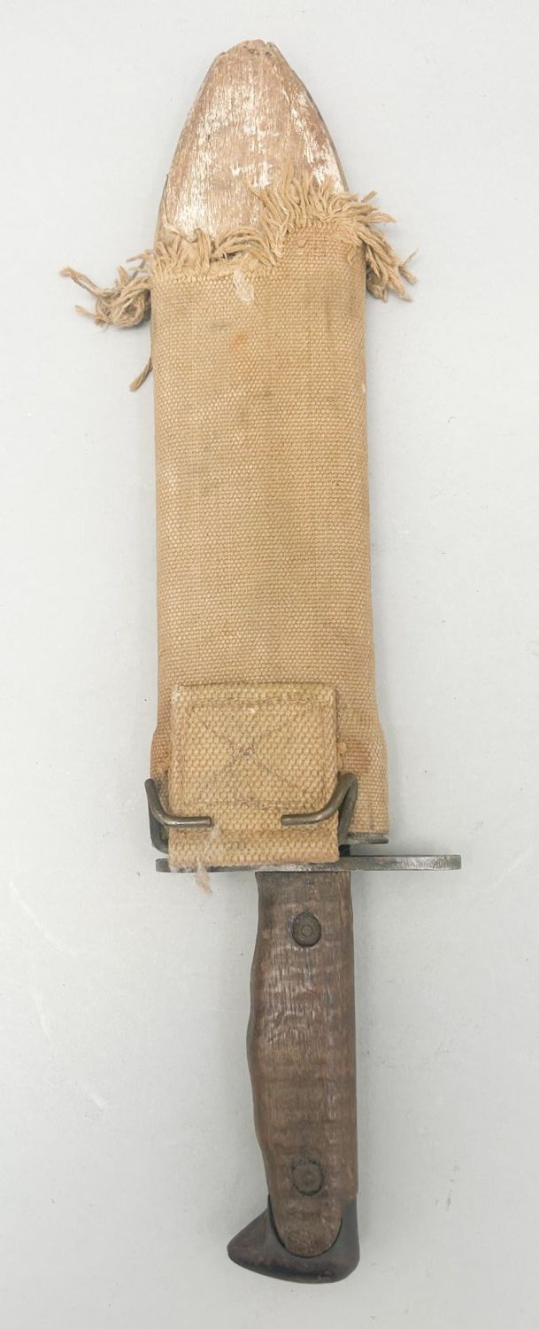 US model 1917 Bolo knife by Plumb with partial scabbard, sheath size 10.5"l and knife size 15"l Condition: Fair, heavy corrosion and tarnish, sign of age and wear