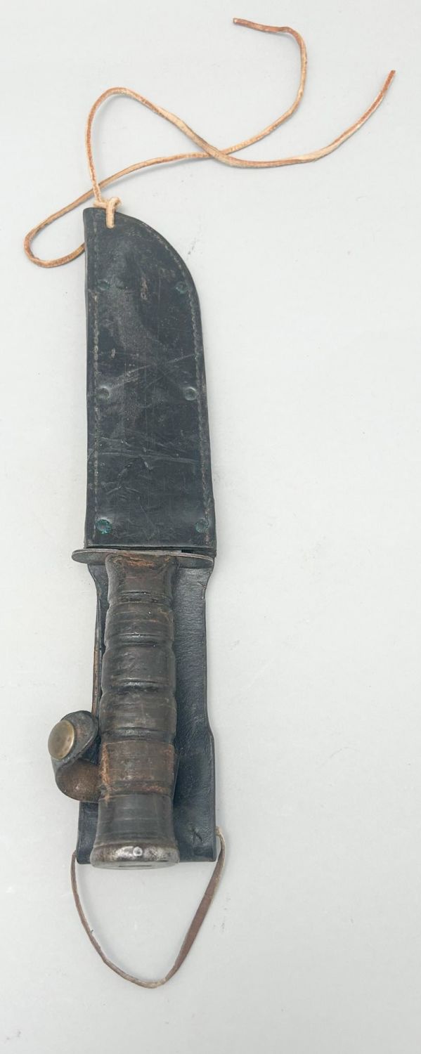 US Military Survival Knife with black wooden handle in leather scabbard, sheath size 12.75"l and sword size 12"l