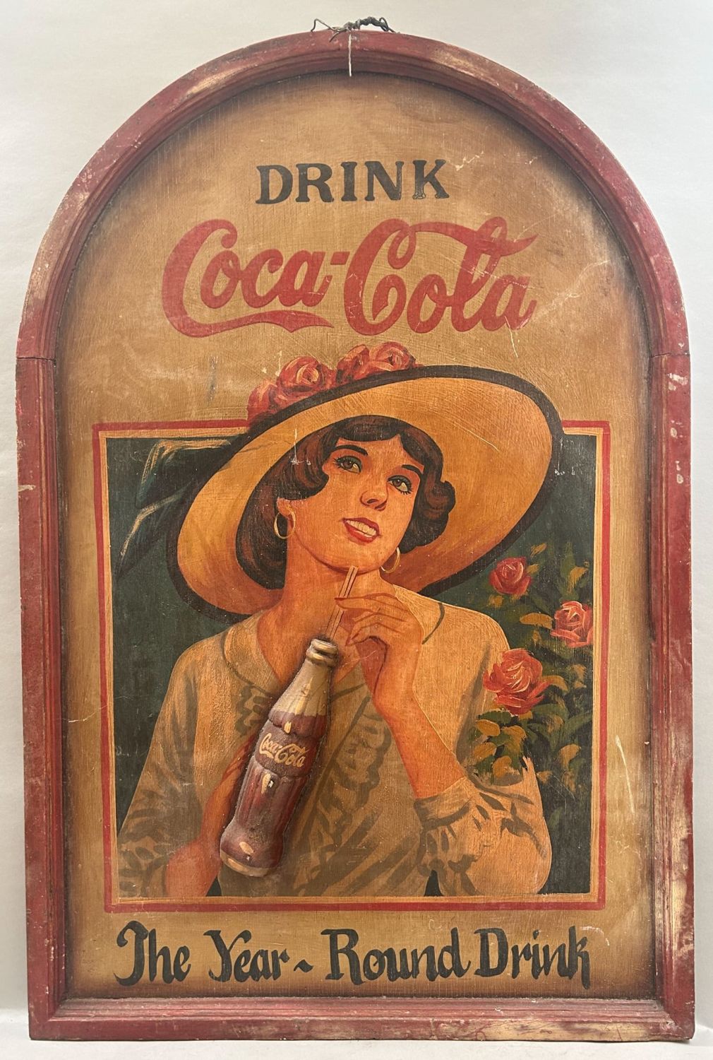 Vintage hand painted wooden Coca Cola sign, woman holds a 3D bottle of Coca Cola, unsigned, frame size 35.75"l x 24"w