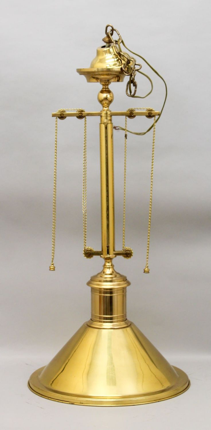 MCM Brass pulley adjustable height pendant light fixture, mark made in Italy, fullest extended 44"h, shortest 32"h x 16"d