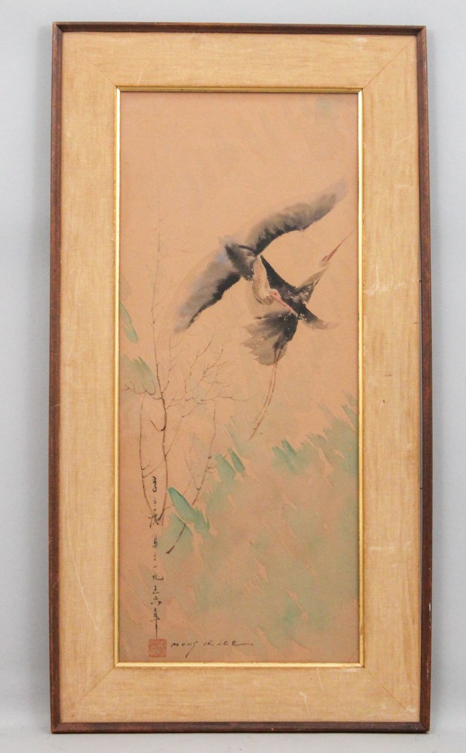 Mong Lee (China/America, 1923-1960) watercolor on paper "Two Cranes" scene, signed lower left, framed, under glass, label on verso, 23"h x 10"w (sight) 29"h x 15.25"w (frame)