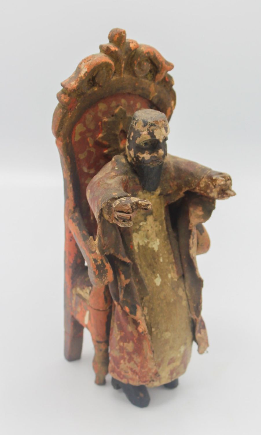 Antique polychrome carved wood religious statue, possibly from 17th-18th century, unmarked, 10"h x 3"w x 4"d