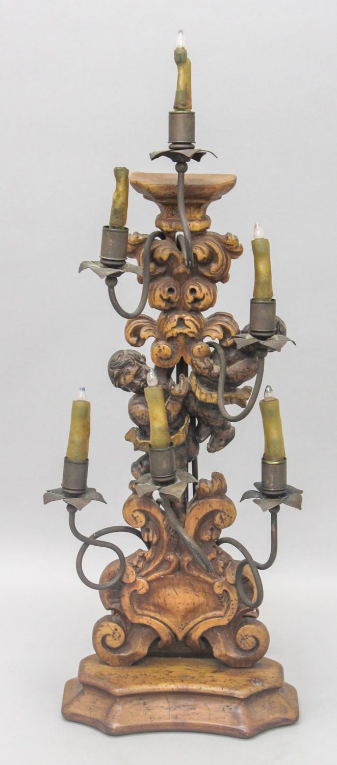 Vintage cast resin table lamp with cherubs and six candle light like, unmarked, 22"h x 8"w x 4"d Condition: Good, untested, signs of age and use