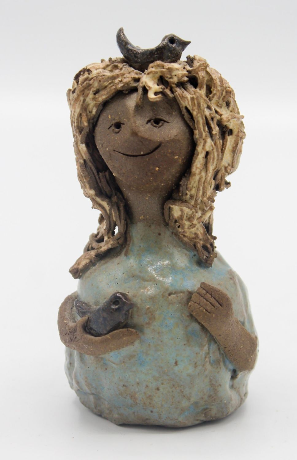 Fired clay Weed People "Girl with Bird" sculpture by Audrey Nelson, marked on bottom AN, 4"h x 2"w Condition: Good