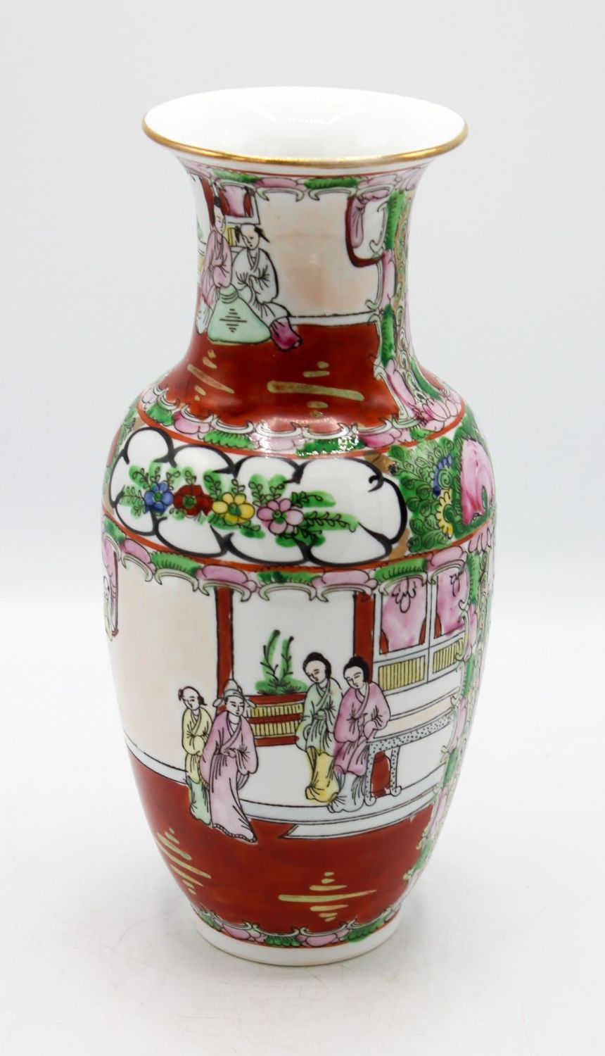Vintage Chinese Rose Medallion porcelain vase, maker’s mark on bottom, 10"h x 4.5"d Condition: Good, some glaze loss on top rim