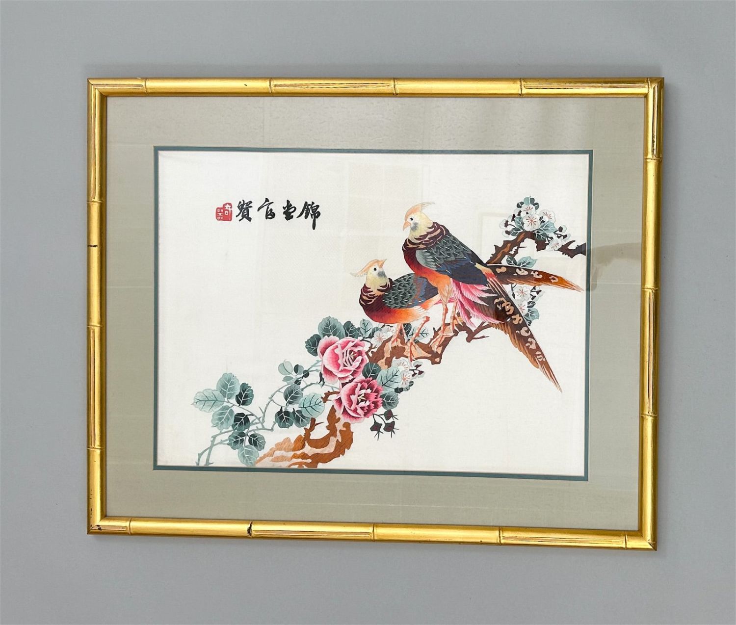 Vintage Chinese embroidery on silk with two crested birds and Chinese characters, red embroidery mark on upper left, 17"h x 23"w (sight) 24"h x 30.75"w (frame)