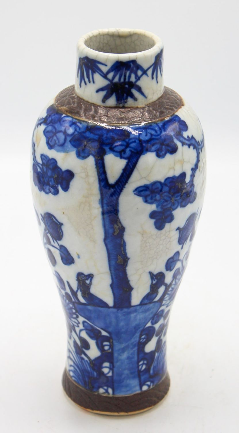 Antique Chinese Qing Dynasty blue and white ceramic vase with crackle glaze, and brown foliate-textured bands top and bottom, maker’s mark on bottom, 9"h x 3.5"d