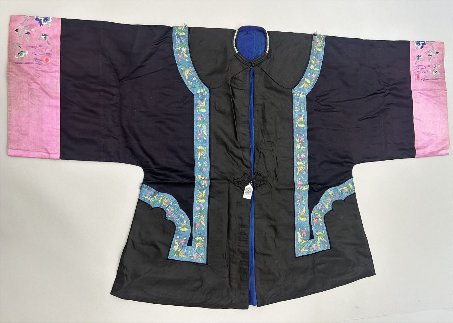 A dark blue-black embroidered silk chinese woman’s informal jacket, 19th century, 19th century, 35"length x 68"width x 37"shoulder, 10" sleeve length x 16" sleeve width