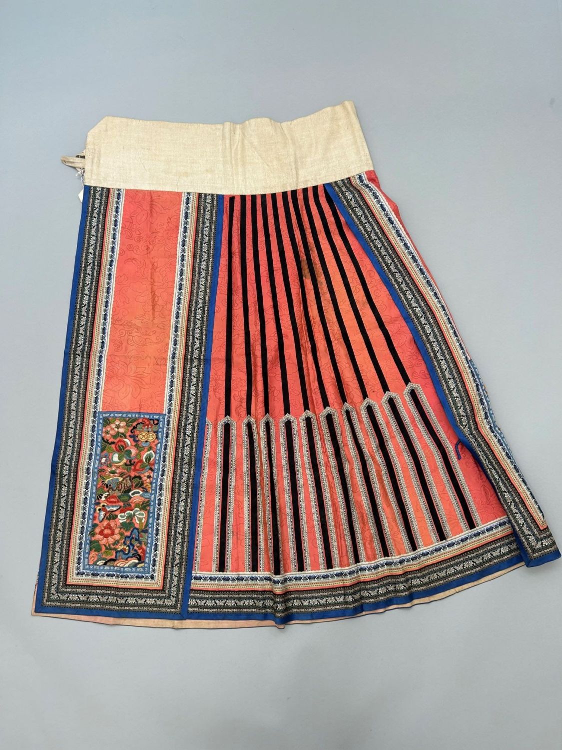 A multicolored silk-mostly orange colored apron embroidered skirt, qing dynasty, late 19th century, 37"length x 44"waist x 84"hem