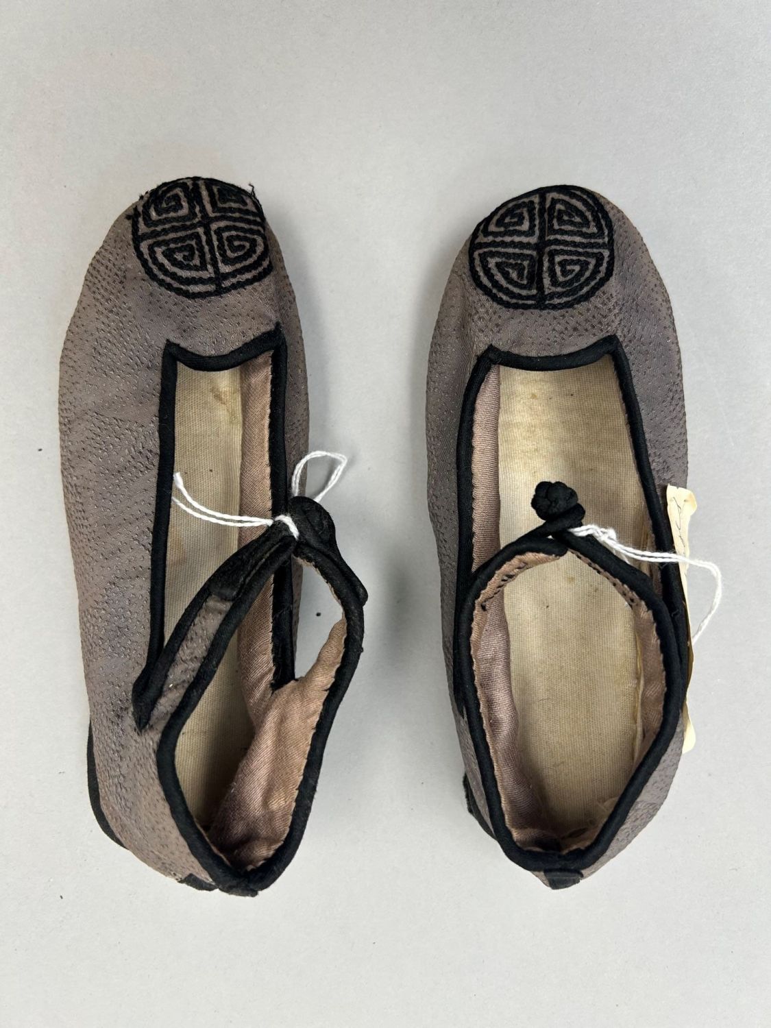 A pair of embroidered silk child shoes, Qing Dynasty, 19th century, 6.5"length x 2.5"width Condition: Fair, some stains, some tears, signs of wear and age
