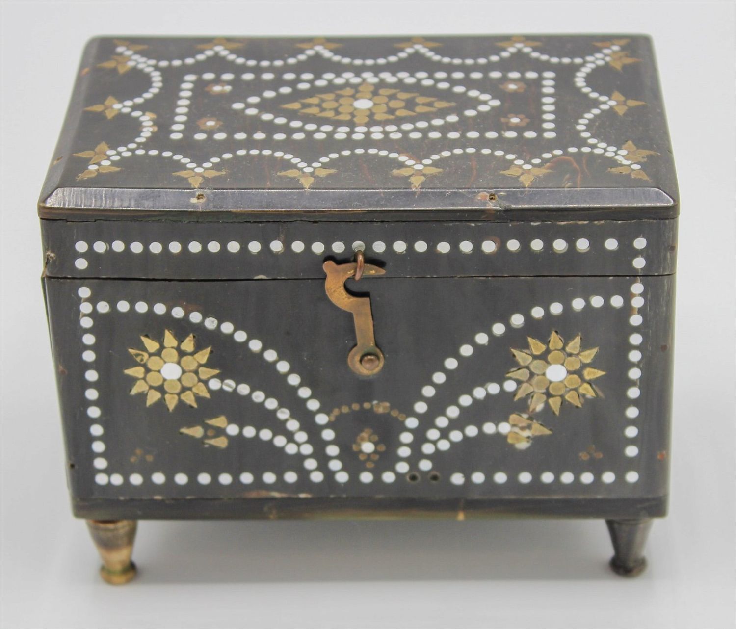 Horn decorative box with metal Inlay accent, 3.75"h x 5"w x 3"d Condition: Fair, missing few inlays, small crack on the lid edge