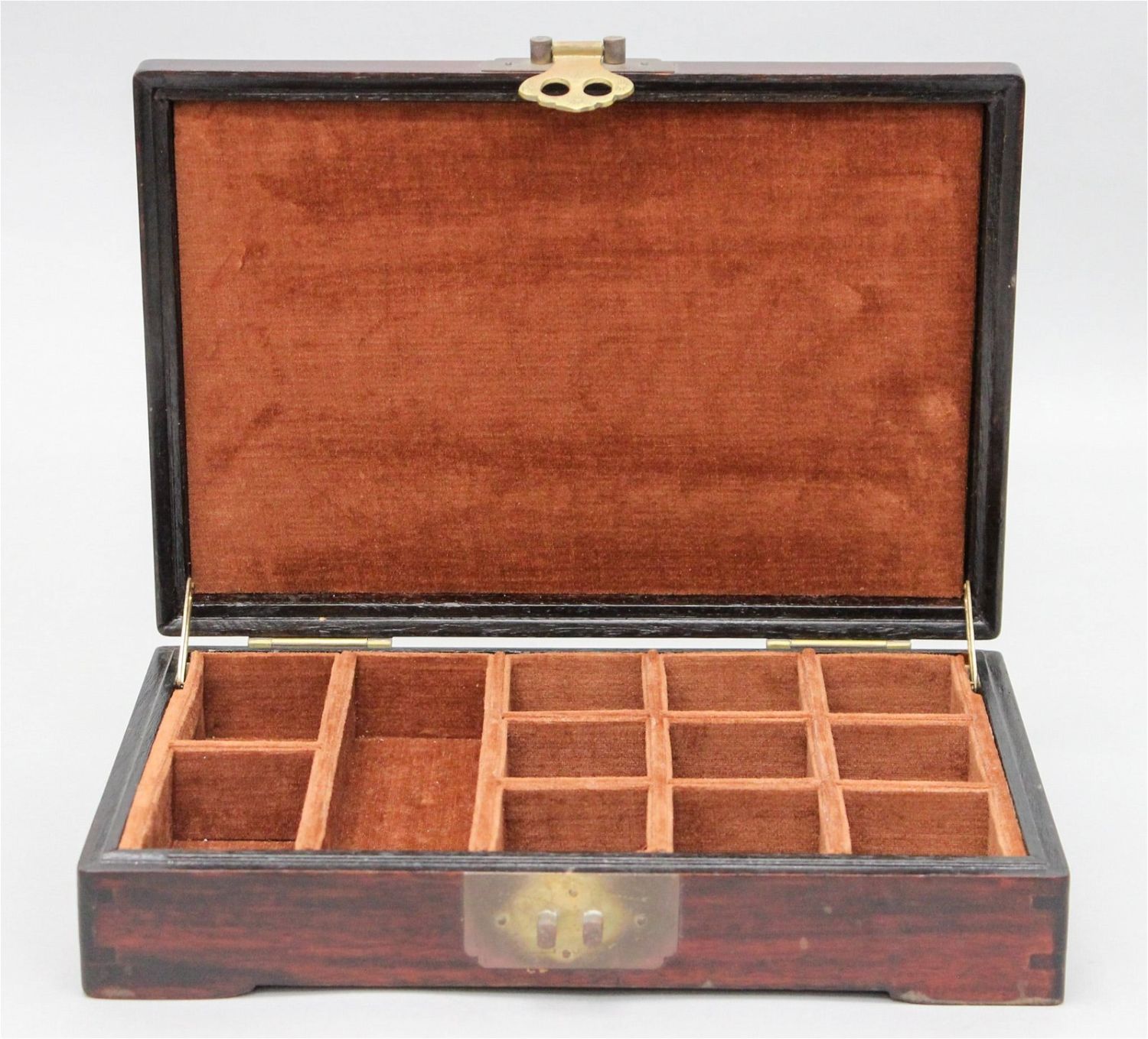 Vintage possibly rosewood and brass hardware jewelry box, carved with chinese longevity ring on top, dovetailed corners, brown velvet lining inside, 2.25"h x 11"w x 7.5"d