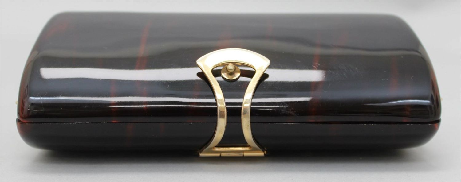 Sak Fifth Avenue Italian faux tortoise shell brown lucite evening clutch with gold tone rope chain strap, brown crushed velvet lining, dust cover included, 3.5"h x 6.5"w x 2.25"d, 14.5" strap drop