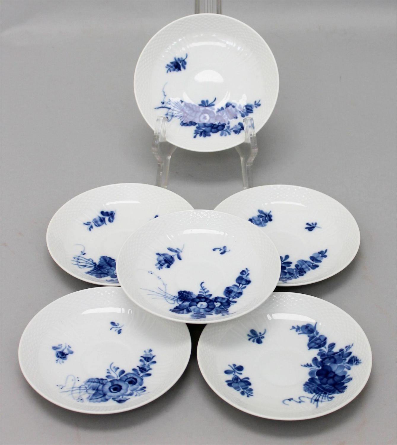 Set of (6) Royal Copenhagen blue flower curved saucers for regular cup, hallmark on bottom, has slash on waves indicating 2nd quality, production date 1965, 5.5" d