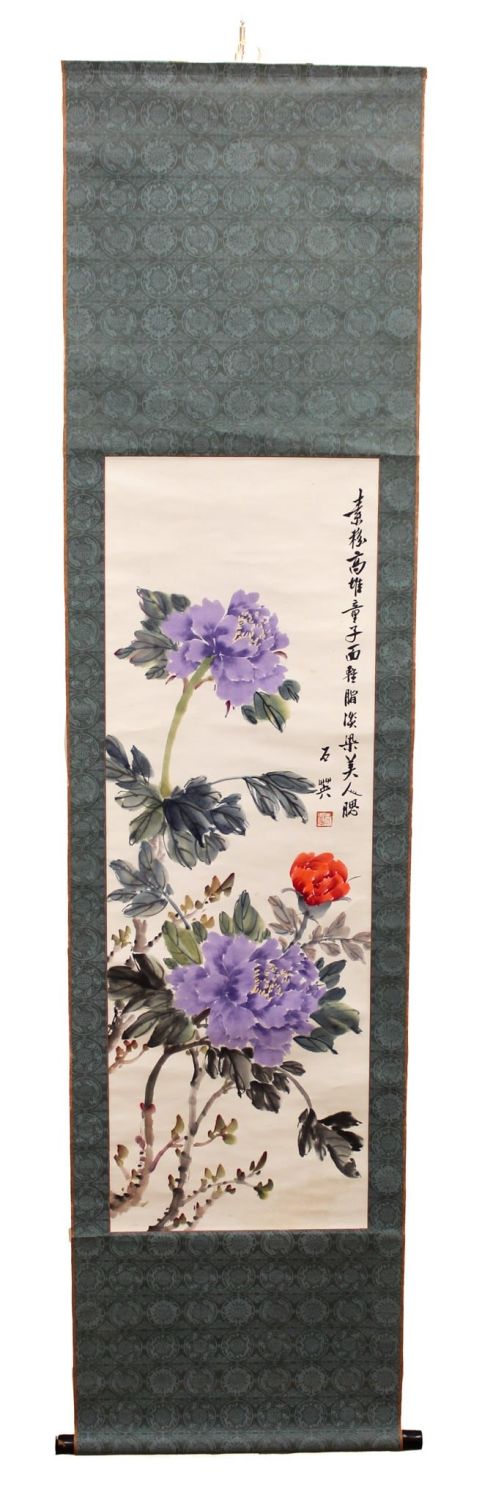 Chinese purple peony scroll water color on paper, signed with seal, 39"h x 13.25"w (sight) 70"h x 17"w (border)