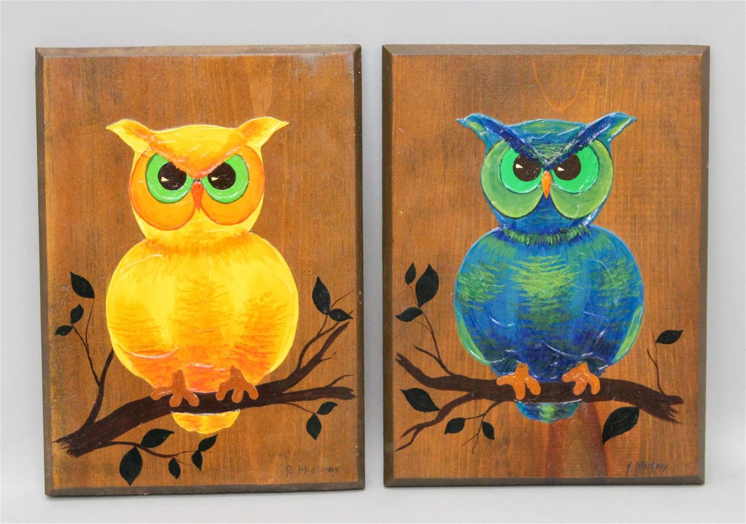Pair of owls folk art, acrylic on board, signed R. MacLeay lower right, label on verso, 9.75"h x 7.25"w Condition: Good, minor nicks